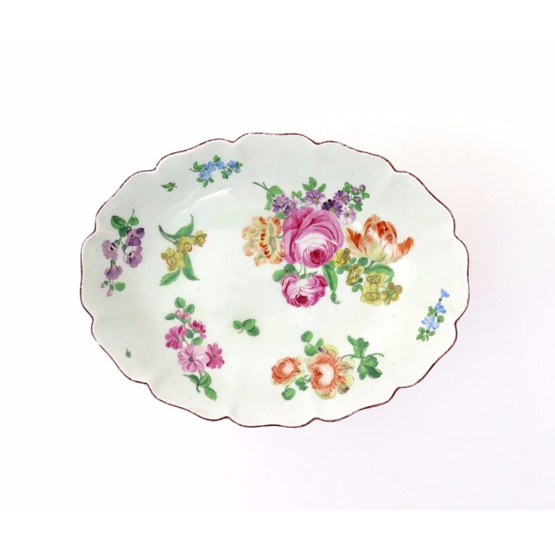 A large lobed Chelsea dish c.1758-60, brightly enamelled with bold flower sprays including rose, tulip, narcissus and forget-me-not, brown line rim, brown anchor mark, minor faults, 28.3cm.