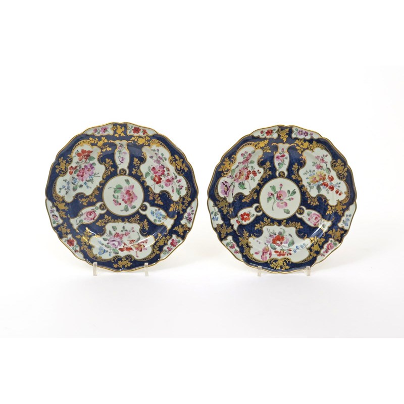 A good pair of Worcester plates c.1770, decorated in the atelier of James Giles with shaped panels of flower garlands edged with further gilt flowers, reserved on a blue scale ground, square seal marks, 22.5cm. (2)