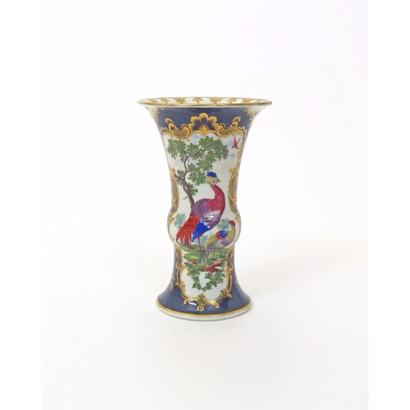 A fine Worcester gu-beaker vase c.1770, the flared and lightly knopped form painted with two panels of brightly-coloured fancy birds beneath leafy trees, within gilt cartouches reserved on a blue scale ground, the exterior rim with two further small panels of moths, blue square seal mark, 15.5cm.