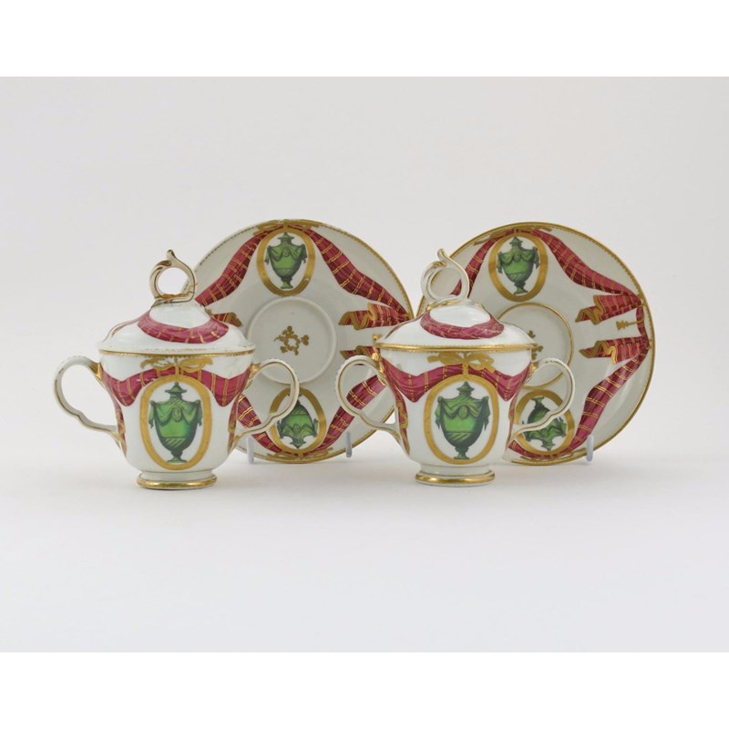 A pair of Chelsea-Derby chocolate cups with covers and stands c.1770, painted with green urns in gilt panels between claret and gilt fabric swags, gold anchor marks, some damages, 13.7cm. (4)