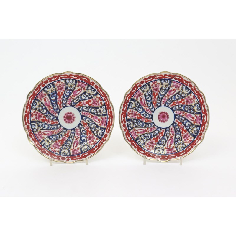 A pair of Barr Worcester dessert plates c.1800, richly decorated in the Queen Charlotte pattern with spiralling stripes of stylized flowers in red, puce, blue and gilt around a central flowerhead, incised B marks, 19.5cm. (2)
