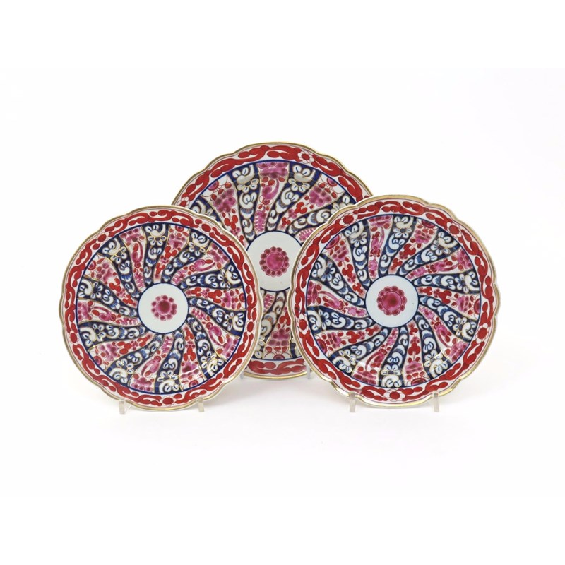 Three Barr Worcester plates c.1800, one large and two small, all decorated with the Queen Charlotte pattern of spiralling stripes in a stylized floral design in imitation of the Imari palette, incised B marks, 24cm max. (3)
