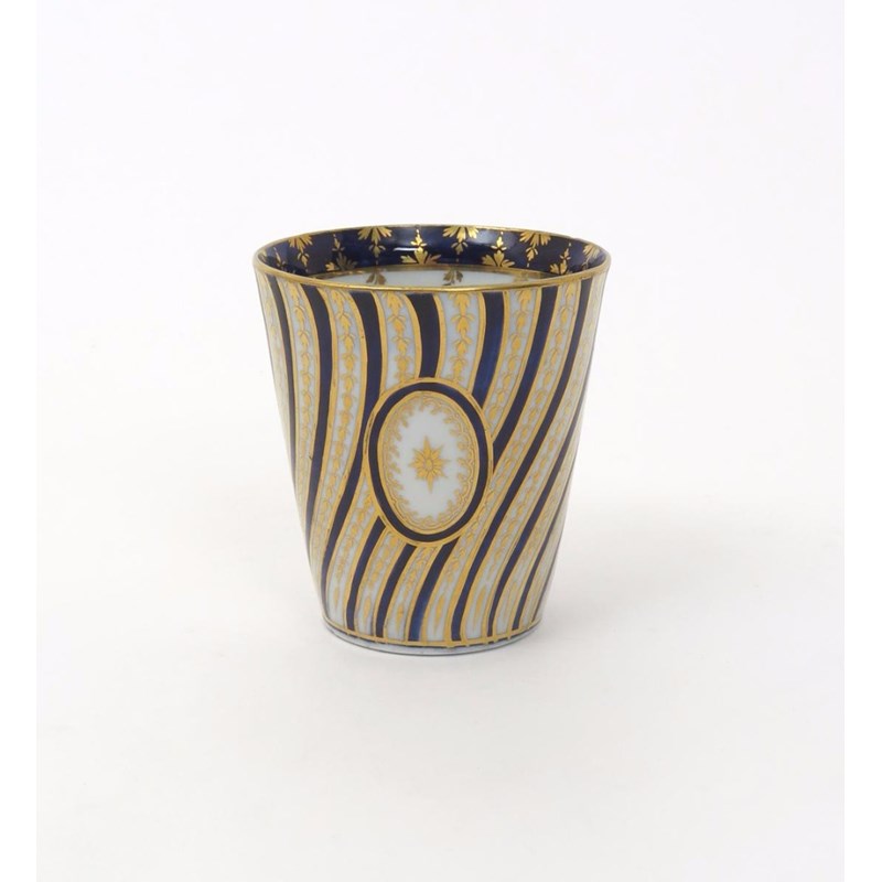 A good Chamberlain's Worcester beaker c.1790-1800, richly decorated with vertical spiralling stripes of deep blue and gilt husks around an oval roundel containing a multi-pointed star, the interior rim with gilt carnation petals on a blue ground, 9cm high.