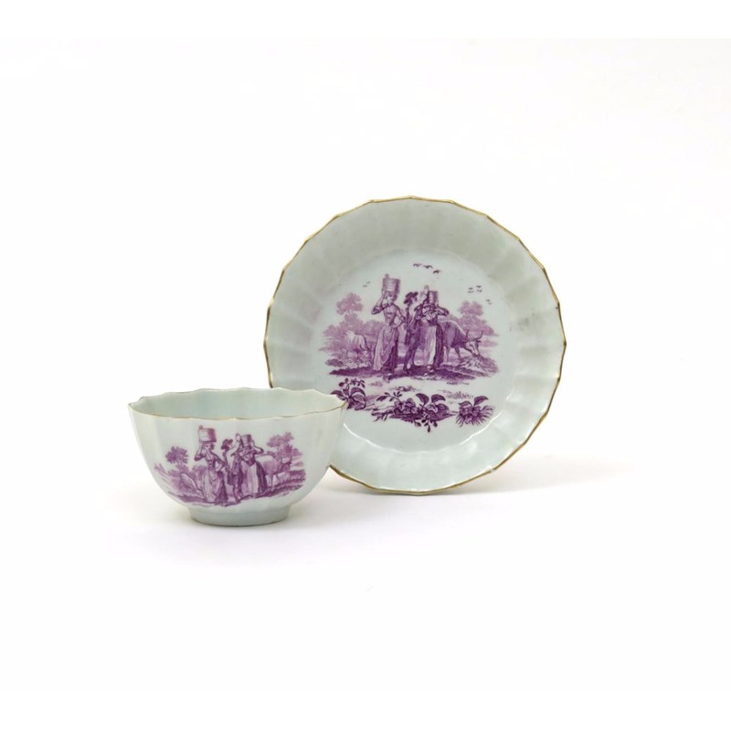 A Worcester fluted teabowl and saucer c.1765-70, of Warmstry-shape, printed in purple with The Milkmaids pattern, the reverse of the teabowl with three cattle, the interior with a swan, blue square seal marks, 11.8cm. (2)