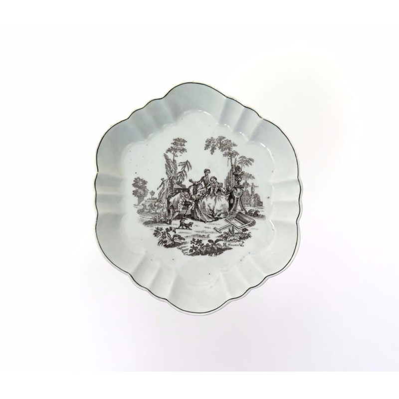 A Worcester hexagonal teapot stand c.1765, printed in black with L'Amour, a courting couple seated on a bench while the lady's maid looks on, 14.5cm.