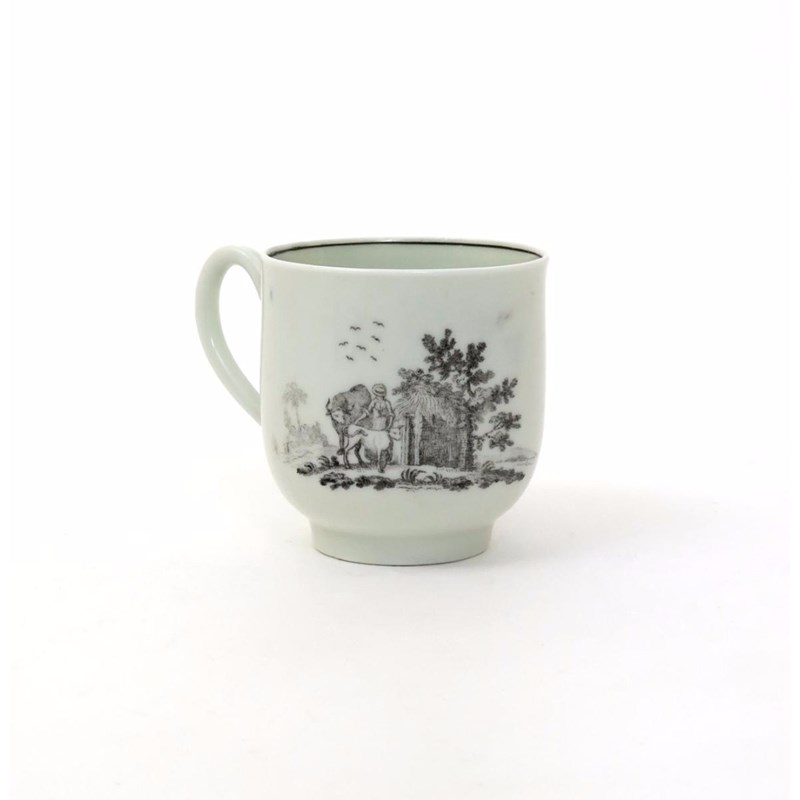 A Worcester coffee cup c.1765, printed in black with the Milkmaids, the reverse with a rare print of a further milkmaid with a cow and her calf standing before a small thatched building, 5.8cm.