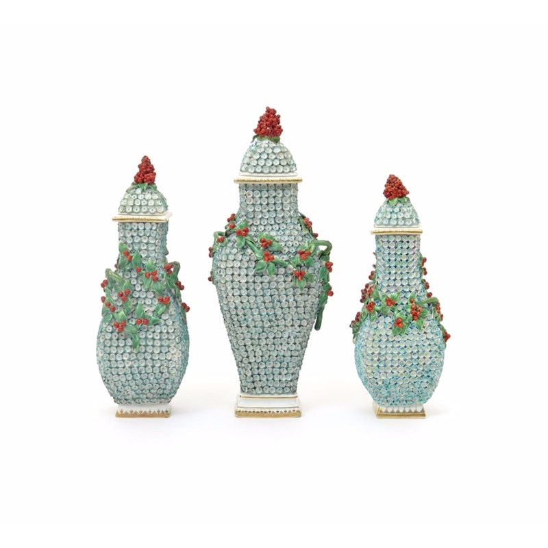 A garniture of three Derby 'Mayflower' vases and covers c.1770-75, of square baluster form, decorated in the Meissen schneeballen style with closely packed flowerheads edged in turquoise with gilt stamen, the shoulders applied with leafy tendrils bearing clusters of red berries, the covers with tall berry finials, some damages, 28.5cm max. (6)