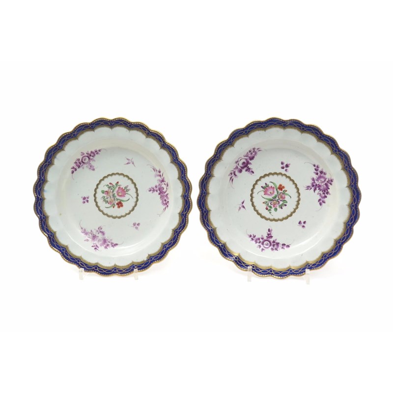 A pair of Worcester dessert plates c.1770, the wells painted with polychrome sprays of rose and heartsease within three further arrangements of flowers in purple monochrome, the scallop-edged rims with a gilt oval design on a blue band, open crescent marks, 21.8cm. (2)