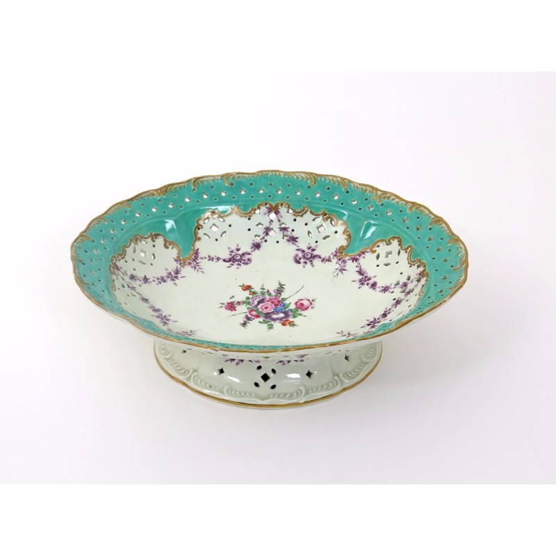 A rare Worcester reticulated tazza or comport c.1775, the well painted with a starburst posy of flowers within further flower garlands in purple monochrome issuing from a shaped sea green rim edged in gilt scrolls, the rim pierced with a geometric design, raised on a low foot with further pierced and feather-moulded decoration, the underside painted with colourful moths and further flowers, two small rim chips, 29.4cm across.