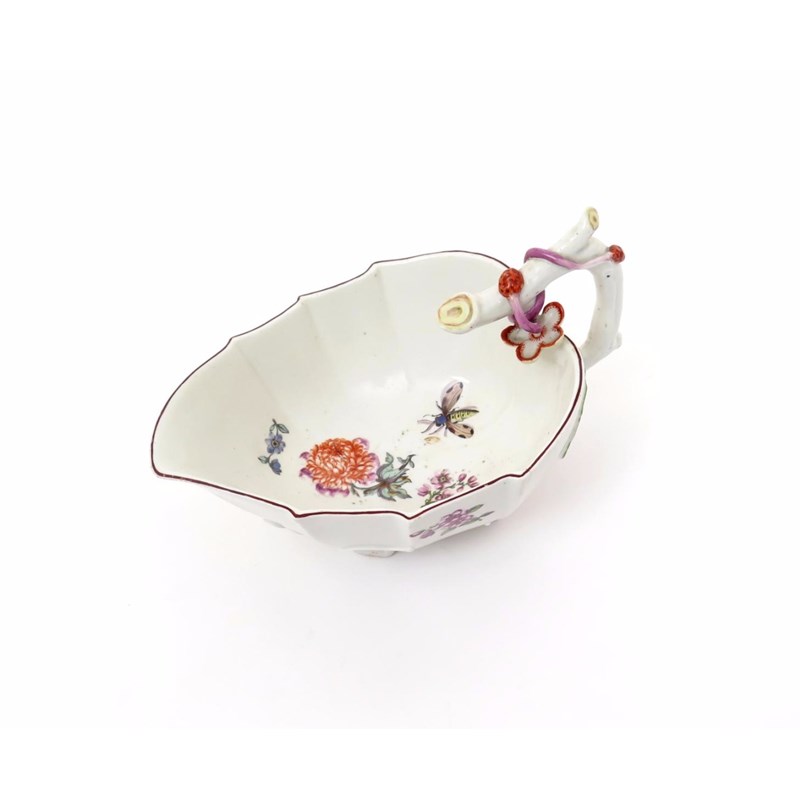 A Chelsea leaf-shaped sauceboat c.1752-55, the deep form finely painted inside and out with naturalistic flower sprays and flying insects, the exterior moulded with sprays of alpine strawberry extending to form the feet and over the crabstock handle, brown line rim, red anchor mark, two small rim chips, 18.5cm.