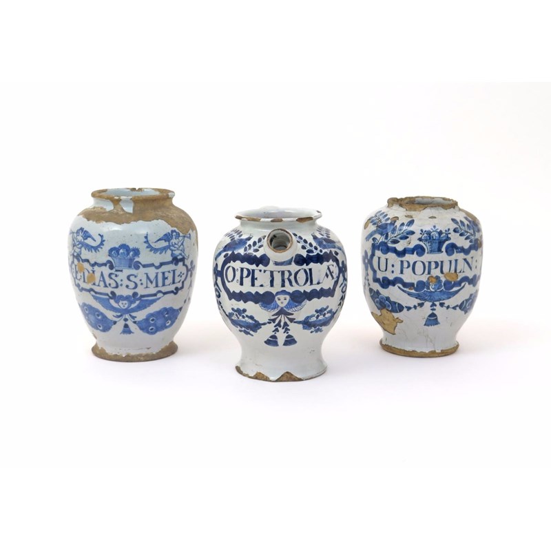 Three English delftware drug jars 18th century, two dry drug jars painted in blue, each with a cartouche surmounted by birds or putti flanking a basket of fruit, inscribed 'U: POPULN' and 'E:DIAS: S: MEL', and a syrup jar with similar decoration beneath a knopped spout, inscribed 'O: PETROLÆ', damages and glaze loss, 19.5cm max. (3)