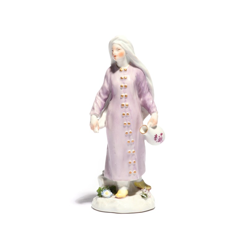A Meissen figure of a Turkish woman mid 18th century, wearing a long shift tunic in pale lilac with gold buttons, carrying a jug in her left hand, raised on a low base applied with flowers and leaves, blue crossed swords mark, 14cm.