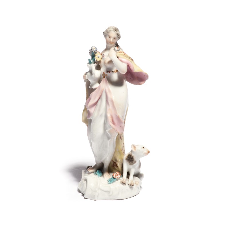 A Meissen figure of a Classical maiden mid 18th century, probably emblematic of Spring, wearing a flowing robe and holding a vase of flowers in her right hand, a dog seated beside her, blue crossed swords mark, 14cm.