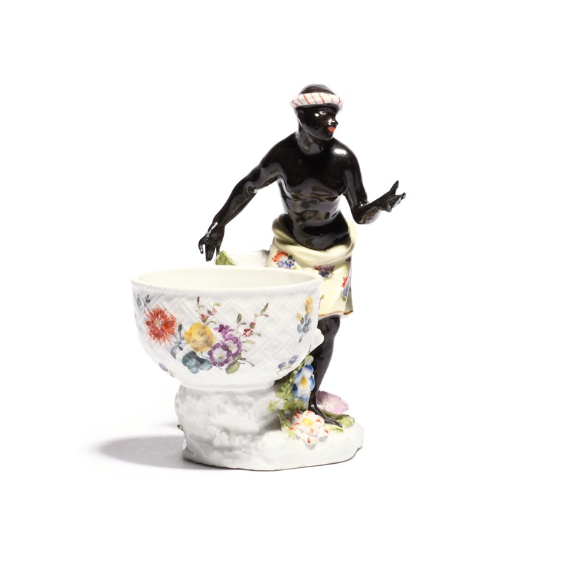 A Meissen sweetmeat figure mid 18th century, modelled as a blackamoor wearing a brightly coloured feathered skirt and headdress, standing beside an ogee-moulded bowl painted with panels of indianischeBlumen, traces of a blue crossed swords mark, minor faults, 16.5cm.