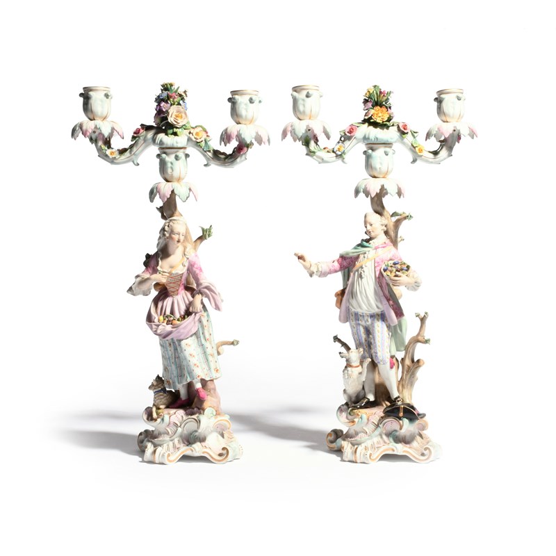A pair of Meissen figural candelabrum 19th century, modelled as a gallant shepherd and his companion, with baskets of fruit, raised on tall scroll bases with a dog and a sheep, before tree stumps supporting two-branch candle supports flanking floral arrangements, blue crossed swords marks, some small damages, 42cm. (2)