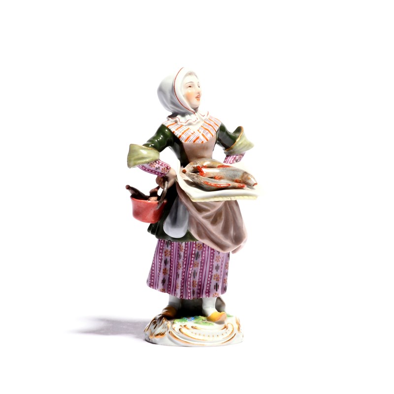 A Meissen figure of a fish seller 20th century, from the Cris de Paris series, a tray of fish supported around her waist, her hands on her hips as she calls out her wares, blue crossed swords mark, 13.5cm.