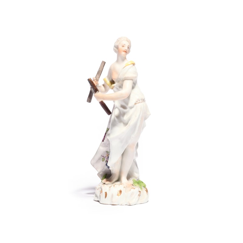 A miniature Meissen figure of a female musician mid 18th century, standing and draped in Classical robes, holding percussive sticks in each hand, blue crossed swords mark, puce numeral 119 beneath the base, minor faults, 11cm.