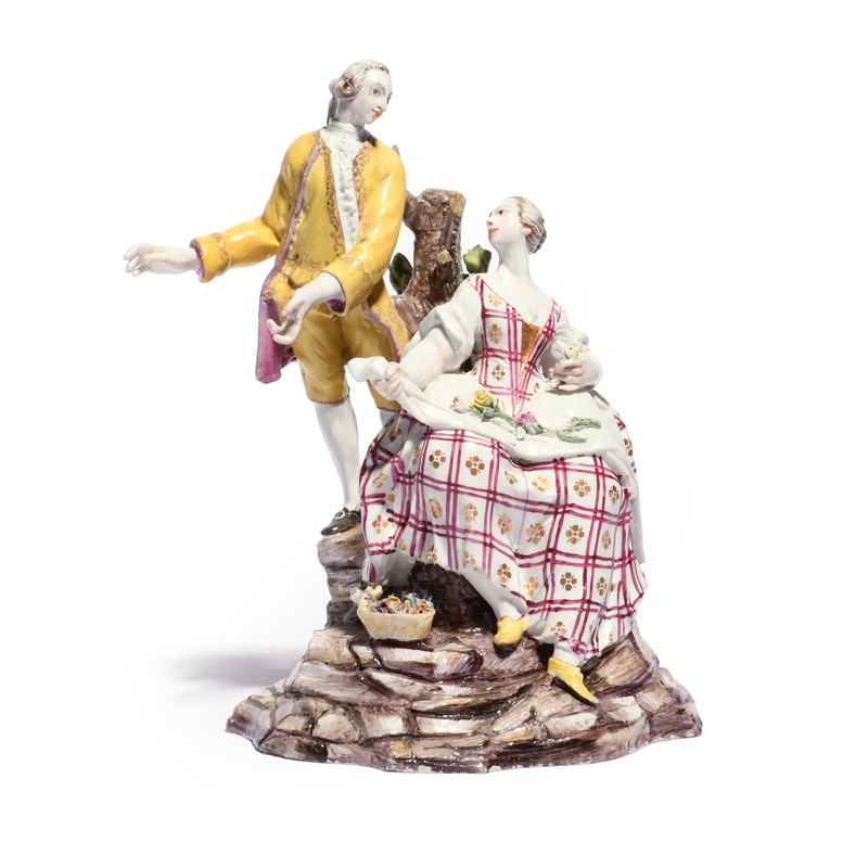 A Doccia figure group c.1780, possibly emblematic of Spring, modelled as a gallant and his companion, he standing before a tree stump, she seated on the rocky base with flowers strewn in her apron, a further basket of blooms by her side, a little restoration, 19.5cm.