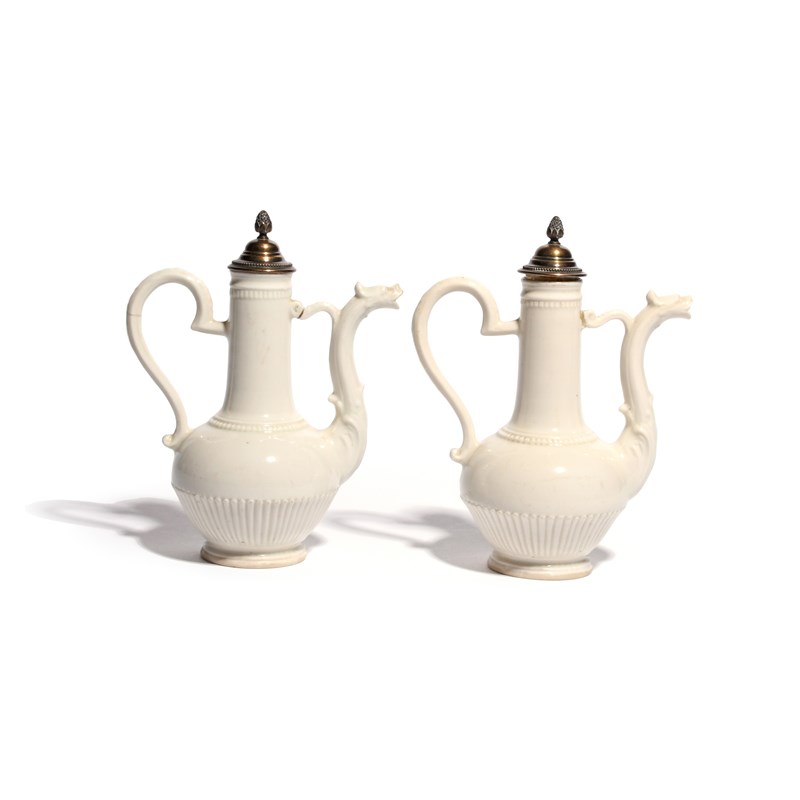 A pair of Italian porcelain ewers and silver covers c.1770, probably Buen Retiro, in the manner of Chinese blanc de Chine, the globular bodies with gadrooned bases, rising to tall cylindrical necks linking mythical mask spouts and fine scroll handles, some faults, the silver covers a 19th century addition with French marks, 16.2cm. (4)