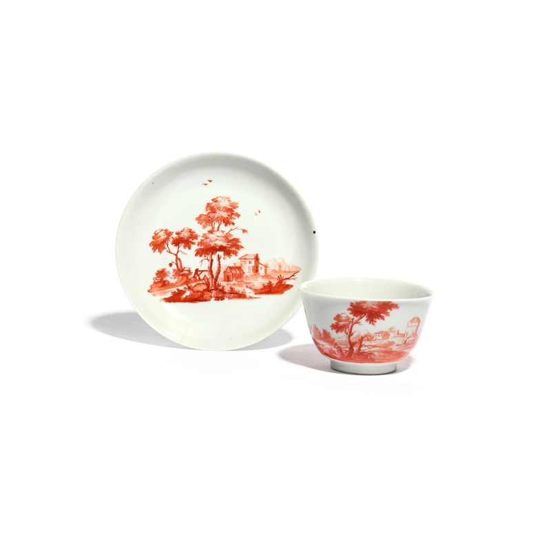 An early Doccia teabowl and saucer c.1748-49, painted perhaps by Giuseppe Romei, under the influence of Anreiter, in iron red monochrome with a continuous landscape scene of country buildings beneath tall trees, a 2cm rim crack to the saucer, 12.7cm. (2)