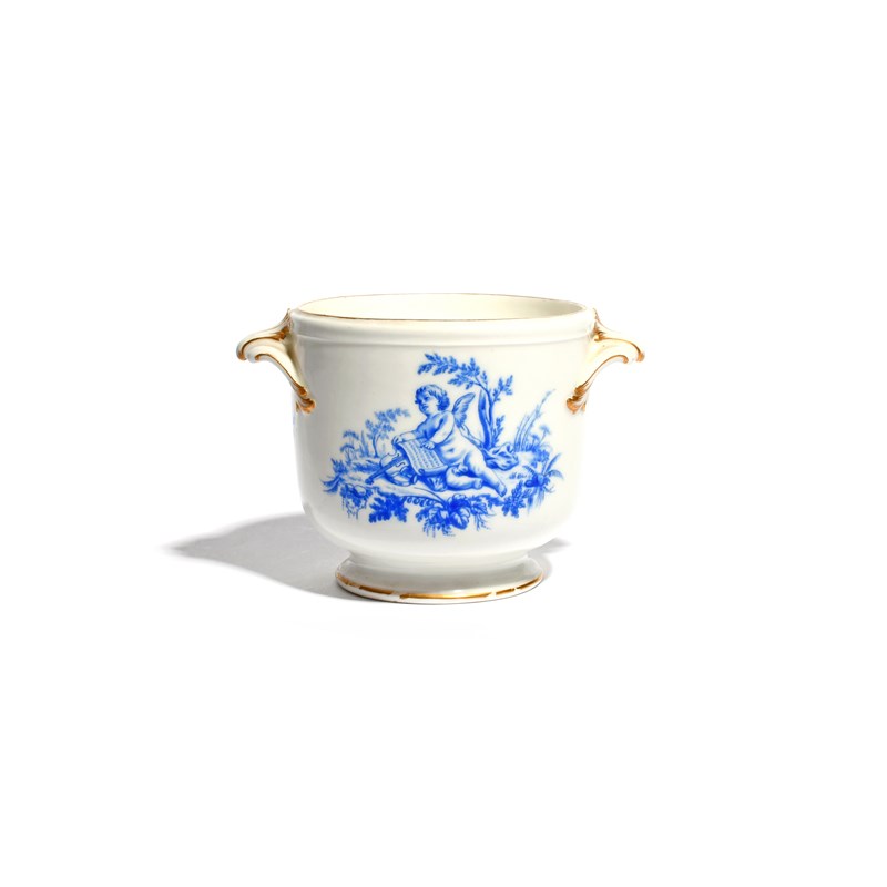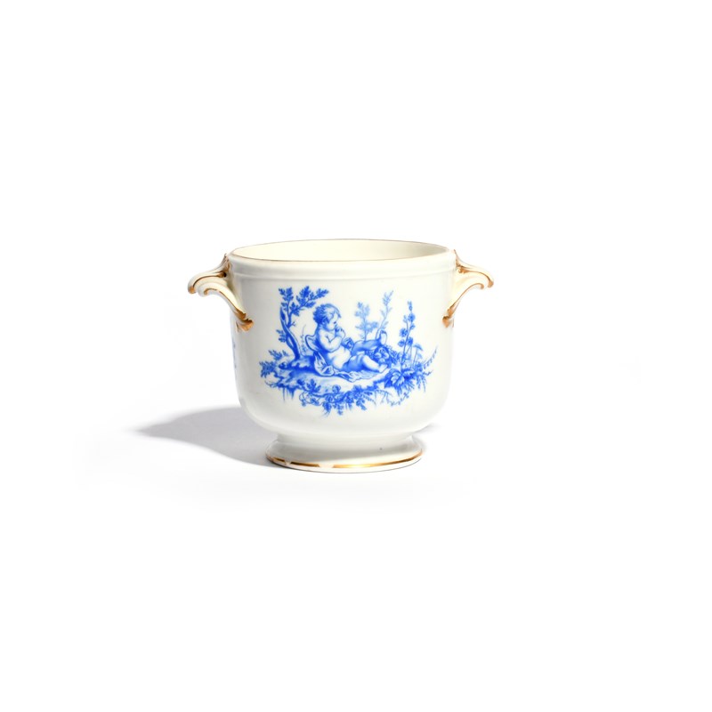 A Sèvres or Vincennes glass cooler (seau à verre ordinaire) c.1755 or later, painted in blue monochrome with scenes of putti, one side reclining with a sheaf of music and a violin, the reverse with a basket of fruits, a small flower spray beneath each scroll handle edged in gilt, blue interlaced Ls marks enclosing the letter C and an anchor painter's mark for Charles Buteux, 12.3cm.