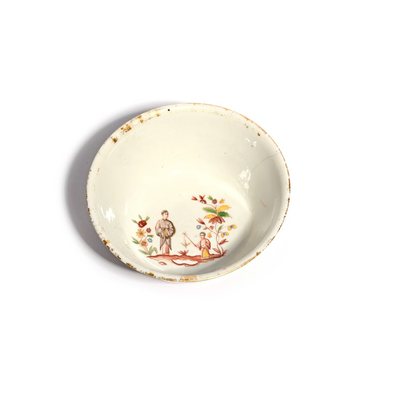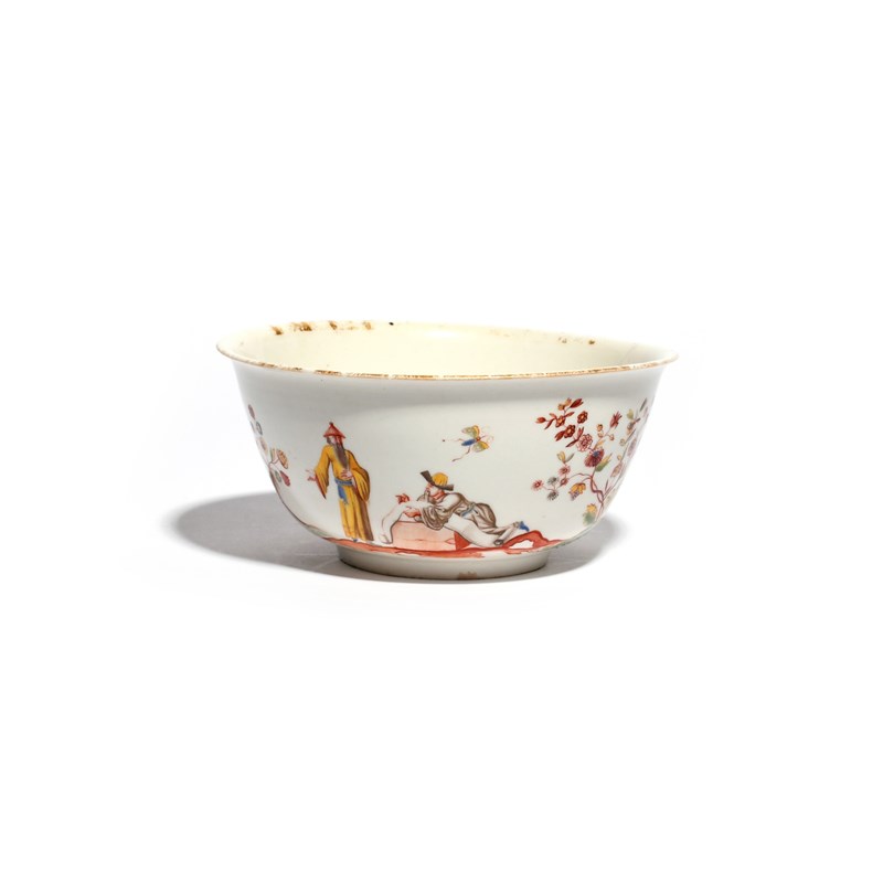 A rare Meissen hausmaler bowl c.1720-25, painted with a kneeling African figure holding out a bowl to a woman in Chinese robes, the reverse with two Chinese scholars discussing an unfurled scroll, between flowering plants, the bowl's interior with a child holding a bird on a stick beside a watchful parent, cracked, 16.5cm.