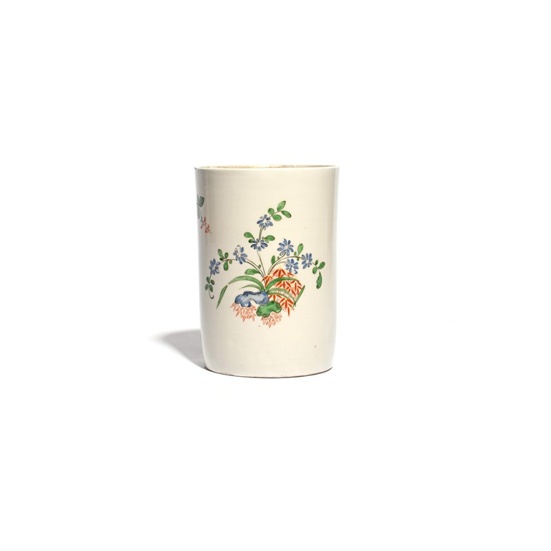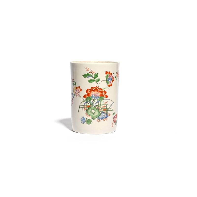 A Du Paquier tobacco jar c.1730, the generous cylindrical body painted in an extended Kakiemon palette with flowering branches issuing from holey roots beside a bamboo fence, the reverse with a smaller vignette of flowering plants, 17cm.