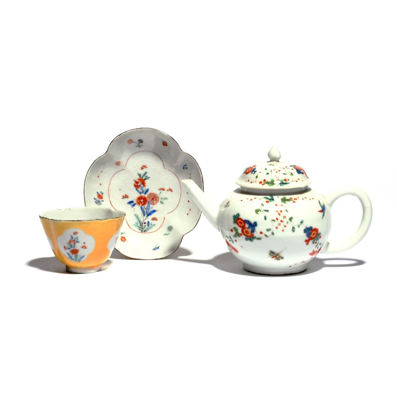 A Dutch-decorated Chinese teapot and cover 1st half 18th century, the globular form painted in Kakiemon enamels in the Meissen manner with birds and insects in flight above flowering branches, red crossed swords marks, and a Chinese quatrefoil teabowl and saucer in imitation of Meissen, painted with Kakiemon flower sprays on a rich yellow ground, blue crossed swords marks, a large chip to the teapot's rim and cover, 18cm max. (4)