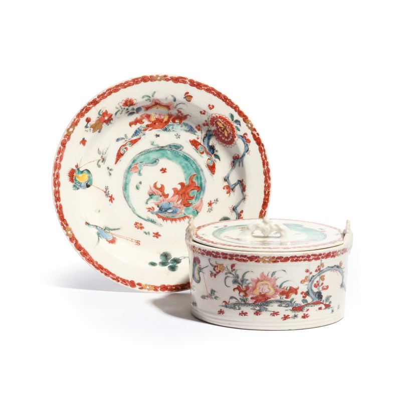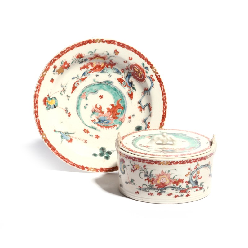 A Bow butter tub with cover and stand c.1756-60, the cylindrical body painted in Kakiemon enamels with the Flaming Tortoise pattern, the eponymous creature with storks and a scaly dragon amidst flowering plants and gnarled branches, the tub broken and restuck, 17.3cm. (3)