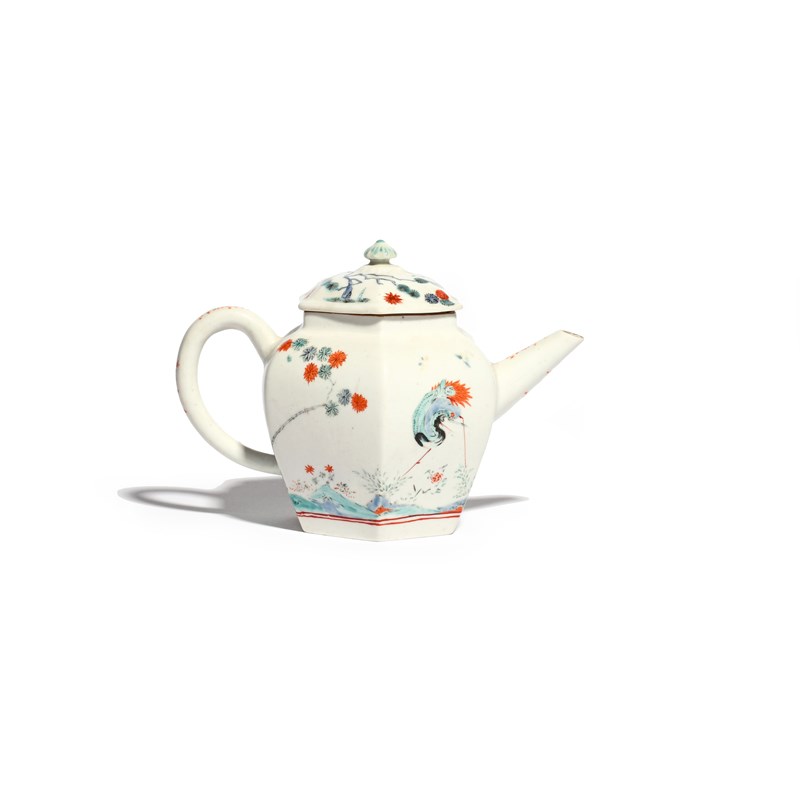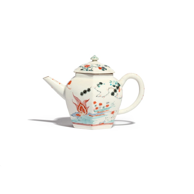 A rare and early Chelsea hexagonal teapot and cover c.1750-52, painted to one side with the Flaming Tortoise pattern, the eponymous creature beneath gnarled pine branches, a stork in flight above the spout, the reverse with a large stork beside flowering branches, the cover broken and restuck, 17cm across. (2)