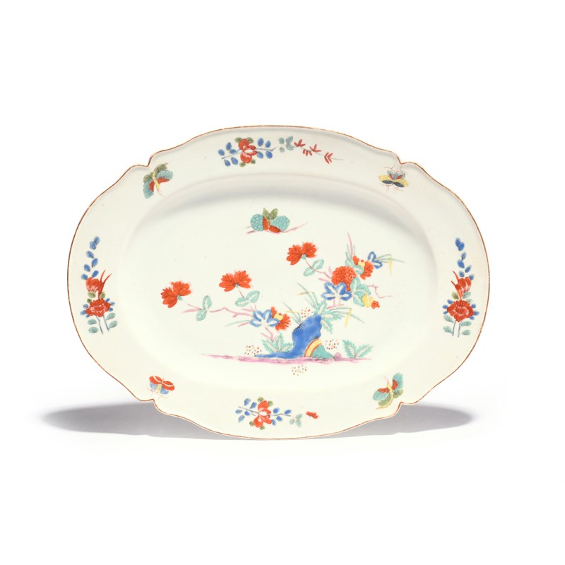 A Chelsea dish c.1753-54, after a silver shape, painted in the Kakiemon palette with a bird in flight above flowering branches and blue rockwork, the rim with further flower sprays and scattered flying insects, brown line rim, red anchor mark, 34.5cm.