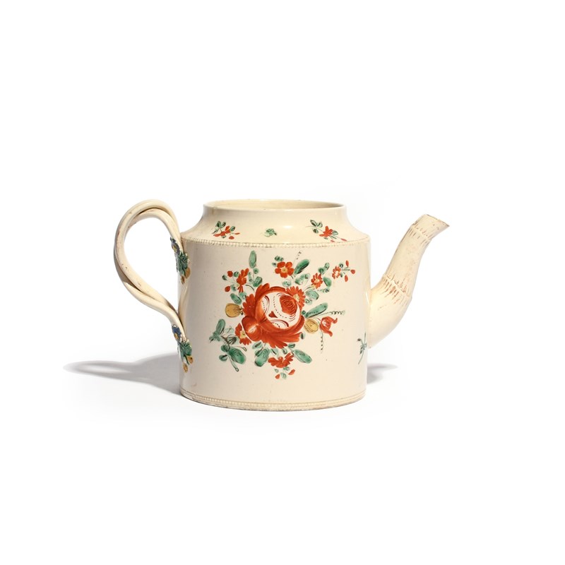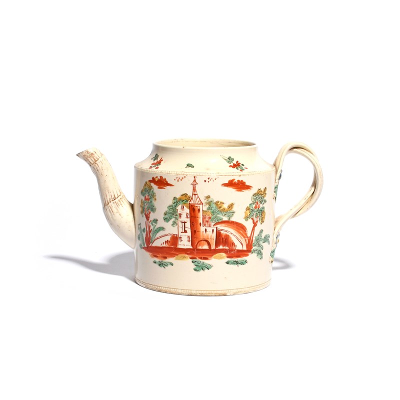 A creamware teapot c.1770, possibly Cockpit Hill, Derby, the cylindrical body painted in a palette of red, green and yellow with tall buildings flanked by trees, the reverse with a large flower spray, the double strap handle issuing from applied flowers, the spout modelled as bamboo, the cover lacking, 21cm.