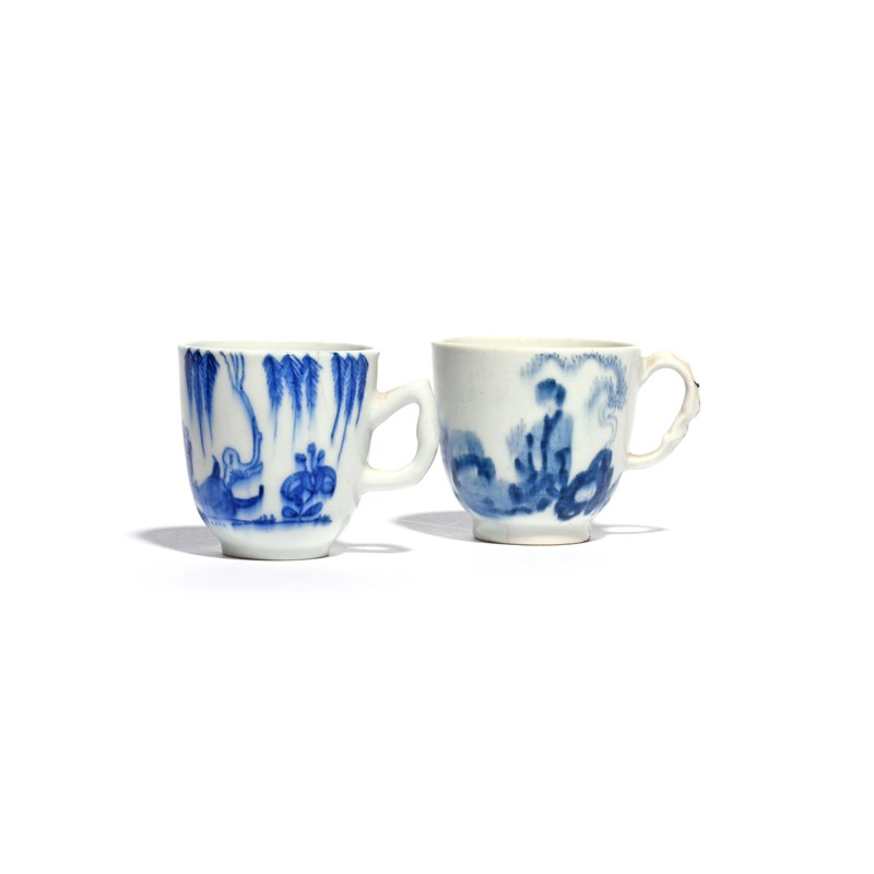 Two Bow blue and white coffee cups c.1753-55, one painted in a bright blue with flowering branches and trailing wisteria, the other with a Chinese lady in a landscape, with moulded handles, some chipping to one, 5.8cm. (2)