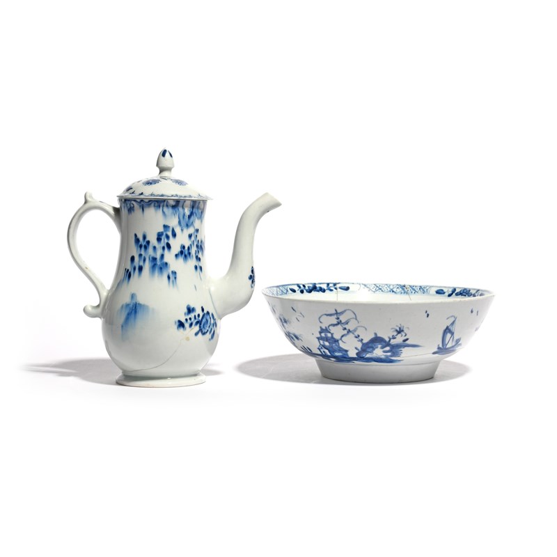 A Lowestoft blue and white coffee pot and cover c.1770, the baluster shape painted with a Chinese figure holding a parasol by vases of flowering branches, the cover with further Oriental flowers, and a Lowestoft shallow bowl painted with a pagoda island landscape, the interior with a panelled trellis rim, damages, 18.5cm max. (3)