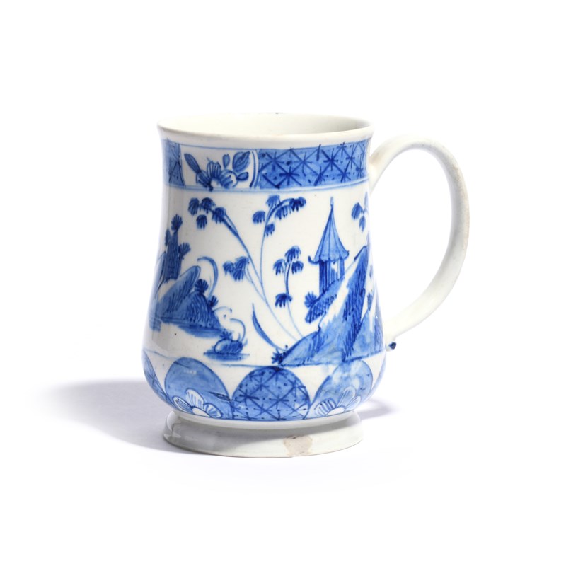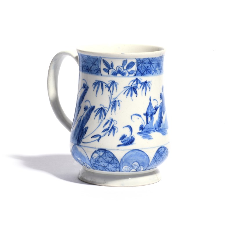 A large and early Bow blue and white mug c.1753, painted in a bright blue with low huts on sloping rocks beneath pine and bamboo, the rim with a panelled trellis border, cracked, 14.8cm.