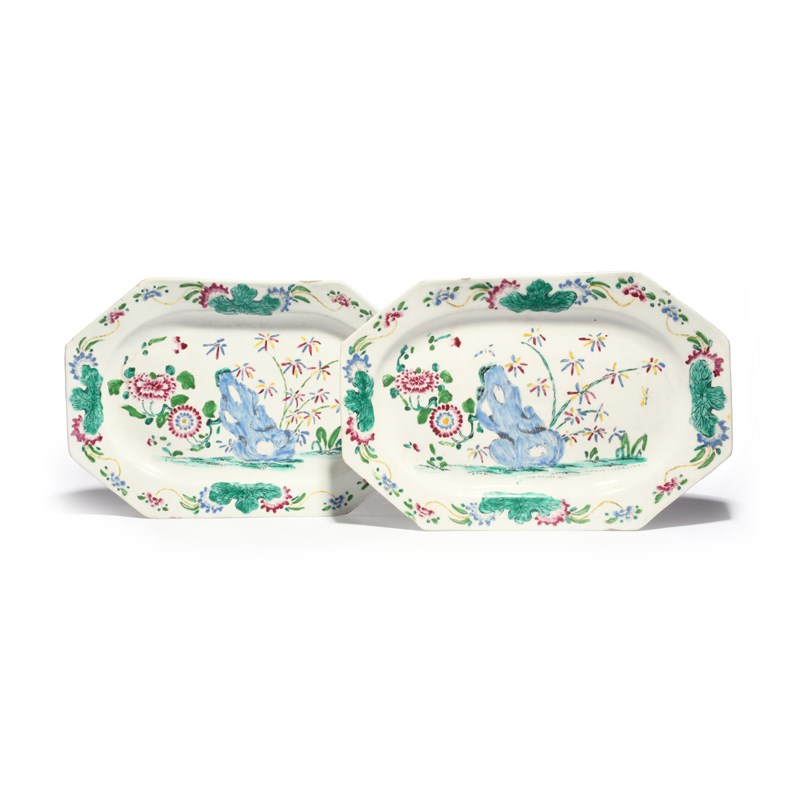 A large pair of Bow meat dishes or chargers c.1755, of elongated octagonal form, boldly enamelled in the famille rose palette with flowering branches of chrysanthemum and leafy bamboo beside holey rockwork, the rim with sprays of lotus and peony, some rim chips, 40.5cm. (2)