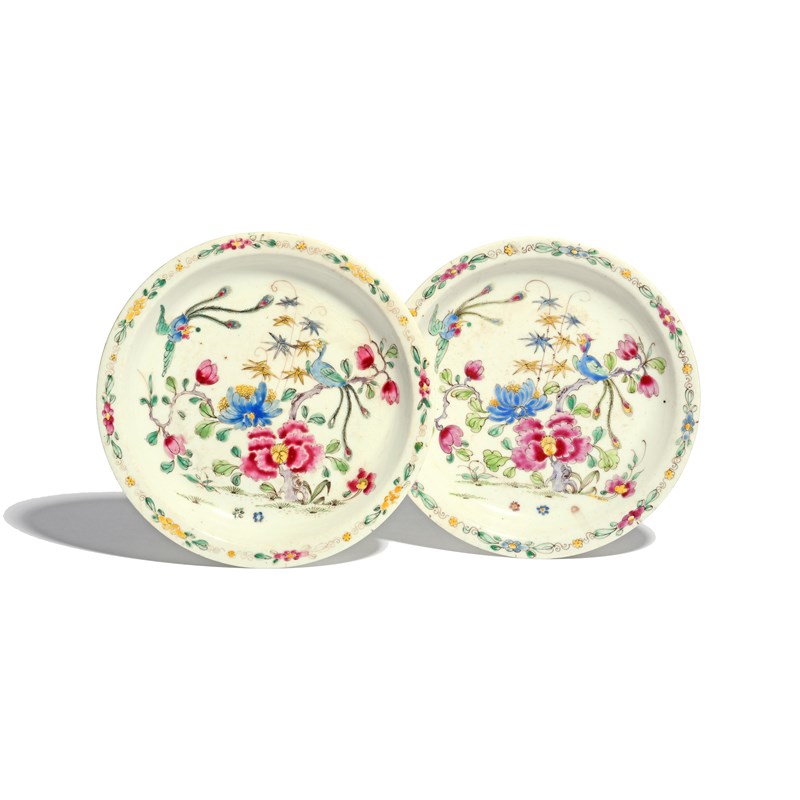 A good pair of Bow plates c.1750-53, well painted in famille rose enamels, each with two long-tailed birds in flight above and perched on flowering peony branches, the shallow saucer forms with narrow rims decorated with a repeated design of flower scrolls, 19.6cm. (2)