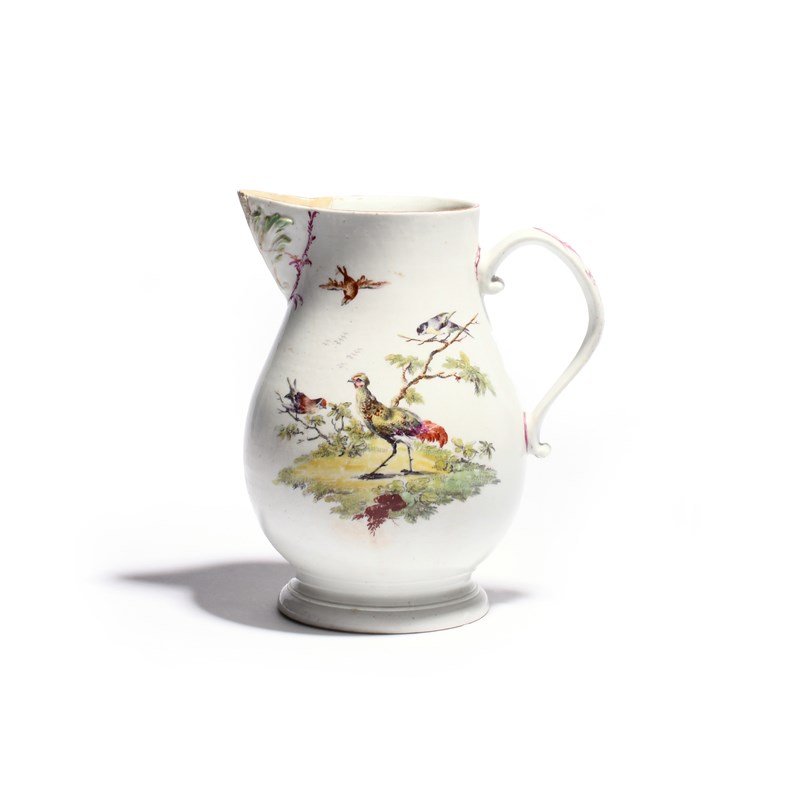 A large Derby cider jug c.1760, painted to one side with a fancy bird strutting before low branches with songbirds perched and in flight above, the reverse with colourful moths and other flying insects, the spout moulded with a leaf motif, the spout broken and restored, 21.6cm.
