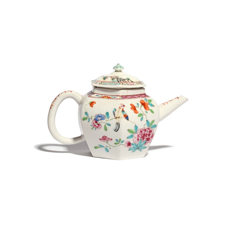 A rare and early Chelsea hexagonal teapot and cover c.1750-52, unusually decorated in famille rose enamels with colourful birds perched on flowering branches, the shoulder and cover's rim with flowerhead panels between cash diaper borders, some chipping to the spout, the cover possibly associated, 18cm. (2)