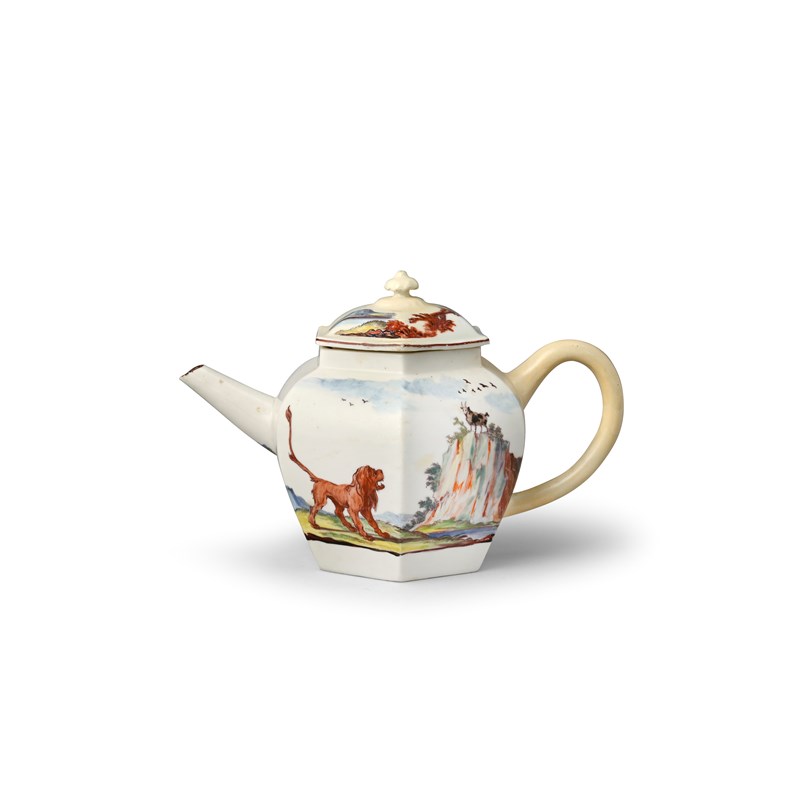 A Chelsea hexagonal Fable-decorated teapot and cover c.1752-55, painted by Jefferyes Hamett O'Neale with a depiction of the Lion and the Goat, the latter standing atop a mountain while vultures circle above, the lion the other side of a stream, looking up towards his former adversary, in a continuous landscape scene with brown trees, the cover with similar landscape decoration, the cover and handle with old restoration, 18cm across. (2)