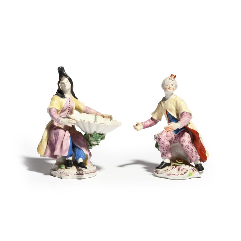 A matched pair of Bow sweetmeat figures c.1755, modelled as a couple in Turkish dress, wearing yellow tunics over longer pink robes, she holding the edges of a large scallop-edged basket painted with flowers in the famille rose palette, some restorations, his dish lacking, 18cm max. (2)