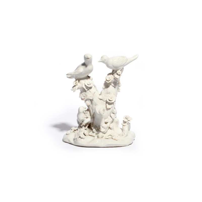 A Bow white-glazed figure group of birds in branches c.1755