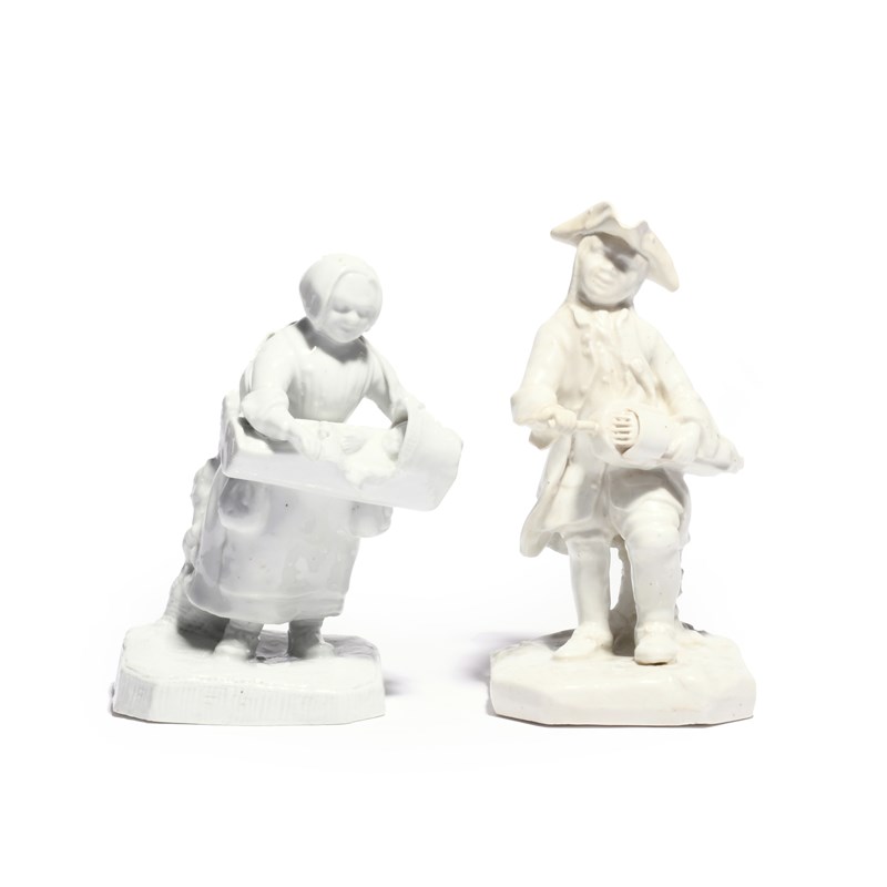 A rare matched pair of white-glazed Bow figures of street musicians c.1752, he standing and playing the hurdy-gurdy, wearing a tricorn hat, his companion modelled as a Flemish woman with a baby, wearing traditional peasant dress, the infant slung around her neck in a small crib, all raised on low chamfered square bases, some restoration to his hat, 15.3cm max. (2)