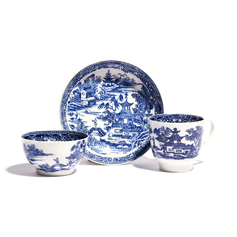 Cf. Geoffrey Godden, English Blue and White Porcelain, pl.483 for a similar saucer and coffee can. Pieces bearing this mark had been traditionally ascribed to New Hall, however, this theory was overturned after 2006. See Roger Pomfret, Northern Ceramic Society Journal, New Hall Hard Paste Blue Printed Wares of the 18th Century pp.24-27.