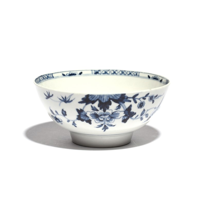 A William Reid (Liverpool) blue and white slop bowl c.1756-60, painted with the Bird on a Branch pattern, orientated towards the foot, a single bird perched on flowering peony branches, the interior rim with a panelled trellis border, numeral 8 inside the footrim, a small rim chip, 15.6cm dia.