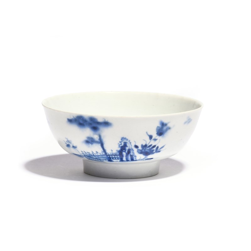 A Worcester blue and white slop bowl c.1754-56, painted with the Plantation pattern, with bamboo and flowering branches by a low fence, the reverse with a low hut on a rocky island, workman's mark, a few small filled rim chips, 13cm dia.