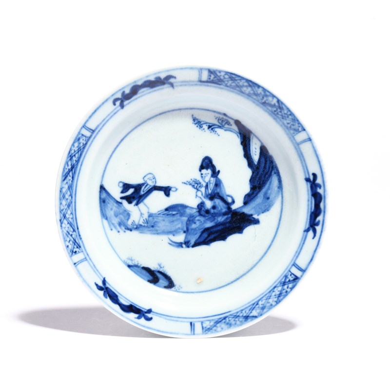 A small Richard Chaffers (Liverpool) blue and white plate c.1758-60, painted with the Jumping Boy pattern, an exuberant Chinese youngster beside his seated mother, within a panelled flowerhead and trellis border, 12cm.