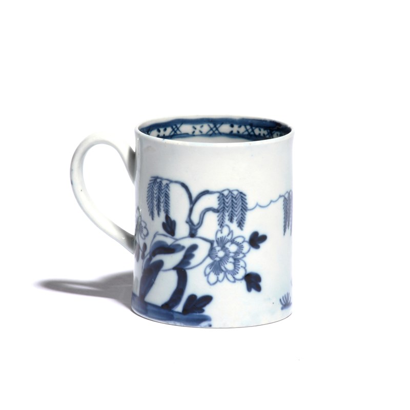 A Richard Chaffers (Liverpool) small blue and white mug or coffee can c.1758-60, the slightly tapered body painted with flowering peony and wisteria issuing from rockwork, the interior rim with a trellis border, 6cm.