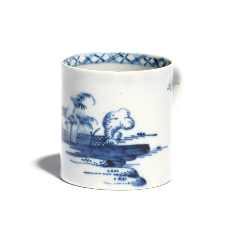A Richard Chaffers (Liverpool) small blue and white mug or coffee can c.1758-60, painted with bamboo and 'Triffid' type rockwork beside a low trellis fence, 6.5cm.
