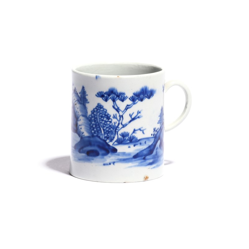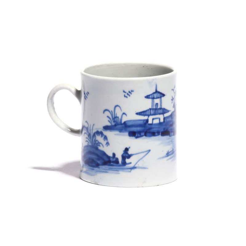 A Vauxhall blue and white small mug or can c.1755-58, the cylindrical form with a slightly flared foot, painted in a bright blue with a figure fishing in a continuous pagoda island landscape, 6.7cm.